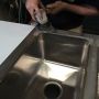 This is a long stainless steel bench that was fabricated for a commercial kitchen application. It includes a separate stainless steel overhead shelf and brackets, stainless steel sink and single tier under shelf. For this bench we included a wet edge profile around the sink and a full length stainless steel splashback.
